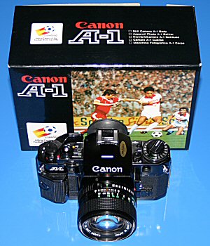Die Canon A-1 - die Legende Zu Ihrer Zeit (vorgestellt 1978) war sie wohl die beste Kamera (Profi-Geräte ausgenommen), die man erwerben konnte. Klein, leicht und vollgestopft mit modernster Elektronik bot sie als Highlights: - Programmautomatik - Zeitautomatik - Blendenautomatik - Blitzautomatik - Arbeitsblenden-Automatik - als erste Kamera überhaupt LED-Anzeigen im Sucher - Tiefenschärfe-Kontrolle - austauschbare Mattscheibe - Anschluss für High-Speed-Motor (bis 5 Bilder/sec) - Messwertspeicherung - und natürlich auch sonst alles, was man erwarten konnte Sie war also fast schon eine kleine Profikamera, auf jeden Fall aber die beste Amateurkamera ihrer Zeit und bis heute für viele der Maßstab - auch in Sachen Styling. Und sie bietet den Zugang zu einem fantastischen Zubehör-Programm, bei dem wirklich kein Wunsch mehr offen bleibt. Technische Daten: Erscheinungsjahr: 1978 Typ: Einäugige Spiegelreflexkamera Auswechselbare Einstellscheiben: ja Sucheranzeige: digital: Verschlusszeit, Blende, Blitz, manuell, Fehlerwarnung Messzelle: Siliziumzelle Messbereich: Lichtwert -2 - 18 Messbereich: mittenbetonte Integralmessung Filmempfindlichkeitsbereich: 6 - 12800 ASA Automatiken: Programm-, Zeit-, Blenden-, Blitz-, Arbeitsblendenautomatik Verschluss: horizontal ablufender Tuchschlitzverschluss Zeitenbereich: 30 - 1/1000 s, B Blitzsynchronisation (X): 1/60 s Sonstiges: Selbstauslöser, Batterieprüfung, Mehrfachbelichtung, Belicht-ungskorrektur Maße (BxHxT): 141 x 91 x 47 mm Gewicht: 620 gr Kaufpreis ca. 900 DM |