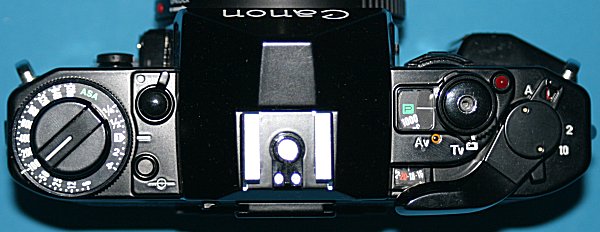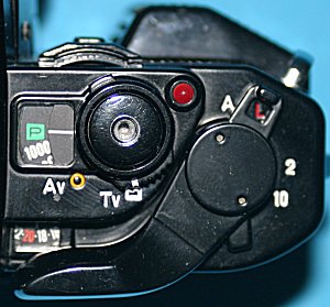 Links und unten sehen Sie weitere Besonderheiten dieser Kamera: Alle Bedienelemente liegen um den Verschluss der Kamera herum, an einem Drehrad erscheint sowohl die Skala zur Voreinstellung der Zeit bei Blendenautomatik (Tv, das grüne "P" dient der Aktivierung der Programmautomatik) als auch der zweiten Skala zur Voreinstellung der Blende für Zeitautomatik (Av). Mit Einstellung der gewünschten Automatik erscheint jeweils nur das Rad für die entsprechende Vorwahl - Verwechslung ausgeschlossen! Des weiteren finden Sie den Hauptschalter (A für Ein und L für Aus) inklusive Selbstauslöser mit 2 oder 10 Sekunden Vorlaufzeit. Während des Ablaufs des Selbstauslösers blinkt die rote LED als Signal. Der unscheinbare Hebel unter dem Schnellspannhebel ist eine weitere kleine Besonderheit: Wenn man diesen Hebel umlegt, funktioniert beim nächsten Spannvorgang zwar der Verschlussaufzug, nicht aber der Filmtransport - so sind Mehrfachbelichtungen ganz einfach möglich. |