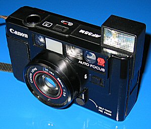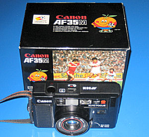 Die Canon AF35M - Spielend vollautomatisch fotografieren Die Canon AF35M ist eine Kamera, die Ihnen wie keine zweite beim Fotografieren alle Arbeit abnimmt. Durch automatische Belichtungsregelung, automatische Scharfeinstellung, automatischen Filmtransport, motorische Rückspulung und ein eingebautes automatisches Blitzgerät werden Aufnahmen mit der AF35M im wahrsten Sinne des Wortes zum Kinderspiel, sobald Sie sich mit den grundlegenden Bedienungshandgriffen vertraut gemacht haben. (aus der Bedienungsanleitung der Kamera) Technische Daten: Erscheinungsjahr: 1979 Typ: Kleinbild-Sucherkamera Objektiv: Canon 1:2,8/38 mm - dreigliedriger Vierlinser Entfernungseinstellung: automatisch durch aktives Autofokussystem Entfernungsbereich: 0,9m - unendlich Verschluss: Programmverschluss - Lamellen dienen gleichzeitig als Blende Sucher: Leuchtrahmensucher mit Parallaxenmarken, Vergrößerung 0,5-fach Anzeigen: Bildbegrenzung, Parallaxenmarken, Entfernungsmessfeld, Entfernungssymbole mit Index, Langzeitwarnung/Batterieprüflampe Gezielte Scharfstellung: mit Hilfe des Selbstauslöserhebels möglich Filmtransport/Rückspulung: automatisch, motorisch Selbstauslöser: einschaltbar über Selbstauslöserhebel, Vorlauf 10 s Messbereich: LW 6 bis LW 17 Verschlusszeiten: 1/8 - 1/500 s Filmempfindlichkeit: von ISO 25/15° - 400/27° Blitz: manuell zuschaltbar, Leitzahl 14 bei ISO 100/21° Spannungsquelle: zwei Mignonzellen 1,5V Abmessungen: 132,4 x 76,9 x 53,6 mm Gewicht: 405 gr (inkl. Batterien) Diese Kamera habe ich sehr günstig gebraucht erstanden - in noch recht gutem Zustand. Für Canon war diese Kamera ein Pionier: die erste Kleinbildkamera mit hochentwickeltem Autofokus - Vorreiter einer neuen Generation von Kameras und erste vollelektronische Kamera von Canon überhaupt. Das linke untere Bild zeigt die Canon AF35M vor ihrer Originalverpackung. Es handelt sich hierbei um die Sonderverpackung anlässlich der Fussball-Weltmeisterschaft 1982 in Spanien, deren offizieller Ausrüster Canon war. |
