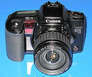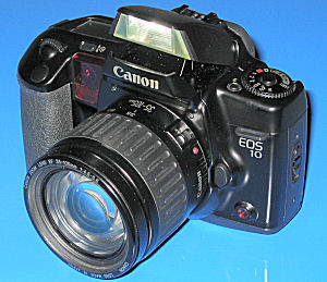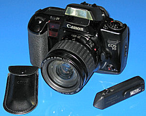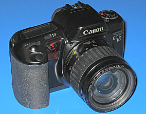 Meine Canon EOS 10 "Die Canon EOS 10 wurde 1990 eingeführt und bot als erste mehrfache Autofokus-Sensoren. Ein Sensor befand sich dabei wie üblich in Suchermitte, er wurde jedoch von zwei weiteren flankiert. Die Kamera war so programmiert, dass sie selbsttätig den bestgeeigneten Sensor wählte, natürlich konnte der Sensor auch manuell gewählt werden. Zudem bot die neue EOS 10 eine neue Art der Sucheranzeige: Durch Einfräsen der Autofokus-Felder in die Einstellscheibe konnte Canon den jeweils aktiven Sensor rot aufleuchten lassen. Das Gehäuse der EOS 10 wies wesentlich weichere Konturen auf als frühere EOS-Kameras. Die Tasten auf der linken Oberseite wurden durch eine Wählscheibe abgelöst. Diese erlaubte eine schnellere Umstellung als mit Taste und Einstellrad. In ihrem Innenleben weicht die EOS 10 ebenfalls radikal von allen früheren Canon Kameras ab. Sie ist die erste Canon-Kamera mit einem neuartigen Filmtransport, der ganz auf eine Zahntrommel verzichtet und statt dessen die Perforationslöcher durch Abtastung per Infrarot zählt. Damit verringert sich nicht nur die Reibung und die Anzahl beweglicher Teile, sondern der Transport wird auch genauer und leiser. Eine etwas seltsame Eigenheit der EOS 10 ist die Möglichkeit der Programmierung mittels Strichcode. In einem Büchlein mit Bildbeispielen kann sich der Benutzer jene Aufnahme heraussuchen, die seiner Aufnahmesituation am nächsten kommt. Dann tastet er einen darunter abgedruckten Strichcode mit einem batteriebetriebenen Lesestift ab, hält diesen an eine Sensormulde an der Kamera und übermittelt die gespeicherten Einstelldaten. Das funktioniert ganz gut, scheint jedoch ein wenig weit hergeholt - und so fand es auch nur negrenzte Gegenliebe. Weitere Strichcode-Beispiele wurden angekündigt, sind jedoch nie erschienen" (aus: Canon Handbuch - Das komplette Canon System, Laterna-Magica-Verlag) Technische Daten: Erscheinungsjahr: 1990 Typ: Einäugige Spiegelreflexkamera Fokussierung: Einstellbarer Einzel-AF, Prädiktions-AI-Servo-AF, Manuell Messfeld: |+| AF-Arbeitsbereich: Lichtwert 0 - 18, eingebauter Hilfsilluminator Sucher-Vergrößerung: 0,74-fach Sucher-Gesichtsfeld: 94% Schärfentiefen-Kontrolle im Sucher möglich Belichtungs-Messsektoren: 8 Stück Belichtungs-Messsystem: Spot-, mittenbetonte Integralmessung Belichtungs-Messbereich: Lichtwert -1 - 20 Filmempfindlichkeit (ASA): 6 - 6400 Belichtungsfunktionen: Intelligente Programmautomatik mit Shift, Blendenautomatik, Zeitautomatik, Schärfentiefenautomatik, Handeinstellung, 4 Motivprogramme, Strichcode-Programme, Programm gegen Verwacklungsunschärfe, Blitzautomatik A-TTL Spezielle Funktionen: Belichtungsreihenautomatik, Belichtungskorrektur, Messwertspeicherung, Langzeitbelichtungen, Mehrfachbelichtungen Verschluss-Zeitenbereich: 1/4000 - 30 s Kürzeste Synchronzeit: 1/125 s Schärfenpriorität Filmtransport, max. Bildfrequenz: 5 Bilder/s Filmtransport, max. Bildfrequenz in AI-Servo-AF: 3,3 Bilder/s Eingebauter Blitz: Zoomreflektor 35mm, Leizahl 3,9 Weitere Merkmale: 14 Individualfunktionen, Spiegelvorauslösung, drahtlose Fernsteuerung, Abblendfunktion Abmessungen (BxHxT): 158 x 106 x 70 mm Gewicht (ohne Batterien): 580 g Das linke untere Bild zeigt die Canon EOS 10 mit dem im Text angesprochenen Scannerstift und dem dazu gehörigen Original-Etui. An der Vorderseite der Kamera erkennen Sie ganz unten links auch den (leicht rötlich schimmernden) Kontakt, mit dem die Daten aus dem Strichcode-Scanner eingelesen werden. Das originale Motiv-Heftchen finden Sie, wenn Sie auf den Link unten zur Bedienungsanleitung klicken. |