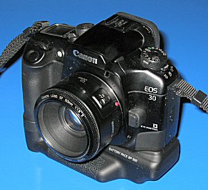 Die Canon EOS 30 - kompromisslos maßgeschneidert "Die EOS 30 soll Ihnen das Fotografieren erleichtern. Und das zeigt schon ein Blick auf ihre Features: das ergonomisch gestaltete Gehäuse mit Aludeckplatten, die höchste Bildfrequenz von 4 B/s bei extrem leisem Filmtransport, die erstaunlich praktischen Bedienungselemente und die hochmoderne Technik durch und durch. So bietet die EOS 30 die perfekte Synthese von Innovation und praxisgerechter Fototechnik." (Auszug aus dem Internet www.canon.de) Technische Daten: Verschluß Vertikal ablaufender Schlitzverschluss, elektronisch gesteuert Feststehender Dachkant-Prismensucher mit Dioptrieneinstellung Vergrößerung 0,70fach mit Objektiv 50mm in Unendlich-Einstellung Okularabstimmung: -1 dpt. Dioptrieneinstellung: -2,5 bis +0,5 dpt Gesichtsfeld vertikal 90%, horizontal 92%. Belichtungsmeßverfahren Offenblenden-Innenmessung mit 35-Zonen 1.Mehrfeldmessung (mit AF-Messfeldern verknüpft) 2.Zentrale Selektivmessung über ca. 10% des Sucherfeldes 3.Mittenbetonte Integralmessung Belichtungsmeßbereich LW 1-20 Filmempfindlichkeitsbereich Automatisch nach DX-Code oder manuell Belichtungskorrektur ±2 LW halbstufig Belichtungsregelung: 1.Intelligente Programmautomatik (mit Verschiebung) 2.Blendenautomatik 3.Zeitautomatik 4.Schärfentiefenautomatik (mit Verschiebung) 5.Vollautomatik (intelligente Programmautomatik ohne Verschiebung) 6.Fünf Motivprogramme: Porträts, Landschaften, Nah, Action, Nacht 7.Manuelle Belichtungseinstellung 8.Programm-Blitzautomatik (E-TTL, A-TTL, TTL) X-Synchronzeit 1/125s Mehrfachbelichtungen bis zu neun Belichtungen einstellbar Autofokussystem TTL-CT-SIR, CMOS-Sensor mit sieben Messfeldern. AF-Funktionen: 1.One-Shot AF 2.Schärfennachführung mit AI Servo AF 3.AI Focus AF 4.Augengesteuerte Schärfennachführung 5.Manuelle Fokussierung Augensteuerung mit 32-Bit-Mikrocomputer, Ansprechzeit ca. 55 ms AF-Arbeitsbereich: LW 1-18 (bei ISO 100/21) Max. Serienbildfrequenz ca. 4 B/s Verschlußzeiten 30s bis 1/4000s halbstufig, X-Synchronzeit 1/125s Stromversorgung Zwei Lithium-Batterien CR123A. Batterieteil BP-300: Vier Alkalin-Mignonzellen oder 2 Batterien CR123A Selbstauslöser elektronisch gesteuert; Vorlaufzeit 10 s Maße: (BxHxT, mm) 146,7 x 103 x 69, Gewicht ohne Batterien 575g |