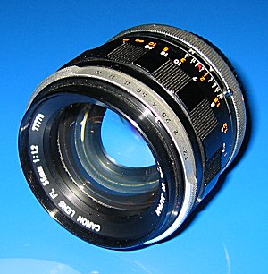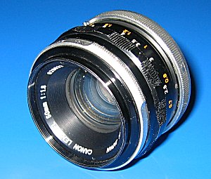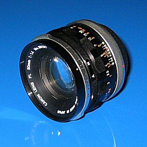 Canon Normalobjektiv FL 1:1,4 / 50 mm Sogenannte Normalobjektive entsprechen weitgehend den Sehgewohnheiten des menschlichen Auges. Hier handelt es sich um das lichtstarke FL-Normal-Objektiv. Bildwinkel 46° Glieder/Linsen 6/7 kleinste Blende 16 Naheinstellgrenze 0,6 m Filterdurchmesser 58 mm Gewicht 340 g |