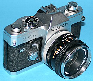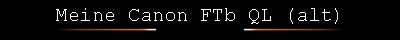 Canon FTb QL "Als Einäugige Spiegelreflexkamera der gehobenen Mittelklasse hat die FTb im Laufe der Jahre Stückzahlen von weit über einer Million erreicht. So gesehen konnte sie über lange Zeit hinweg als das eigentliche "Arbeitstier" dieser Reflexreihe gelten. [...] Sie ist eine Präzisionskamera, deren Ausstattung durchaus auch für eine ganze Reihe beruflicher Aufgaben ausreicht. [...] Interessant ist die Verwendung des gleichen Innenmeßsystems wie in der F-1, das bereits auf die hohen Aspirationen der FTb hindeutet und einen gezielten Einsatz möglich macht." (Auszug aus dem Buch: Günter Richter - Das Canon Reflex System) Technische Daten: Erscheinungsjahr: 1971 / 1973 in der neueren Version Einäugige 35-mm-Spiegelreflexkamera mit Schlitzverschluss Durchblicksucher mit feststehendem Pentaprisma Mattscheibe mit Fresnelllinse und Prismenscheibe Sichtbereich 94% des tatsächlichen Bildbereichs Vergrößerung 0,85-fach Sucheranzeige: Meßzeiger und Blendenöffnungszeiger, rotes Anzeigefeld für untere Grenze des Funktionsbereichs, Meßmarke für die Arbeits-blendenmessung, Batterieprüfung Erschütterungsfreier Spiegel, verriegelbar in der obersten Stellung Bajonettring des Typs FD Schlitzverschluss von 1/1000 s bis 1 s und B Blitzsynchronzeit 1/60 s Auslöseknopf verriegelbar Filmempfindlichkeit von 25 - 2000 ASA Eingebauter Belichtungsmesser mit CdS-Fotozelle, Mittelpunkt-Messsystem zur Ausmessung von 12% der Bildfläche Einlegen des Films mit Schnellladesystem (QL = Quick-Load) Schnellaufzughebel durch einmalige Schwenkung um 174° Doppelbelichtung möglich Größe: 144 x 93 x 43 mm Gewicht: 740 g (nur Gehäuse) Die hier abgebildete Kamera ist eine FTb, quasi die zweite Generation der Canon FT, erkennbar an dem "b" in der Typenbezeichnung - dies bewirkte einen Wechsel von den Objektiven der FL-Reihe zu den neuen FD-Objektiven, welche eine Offenblendenmessung erlaubten. Dies war natürlich ein riesiger Fortschritt und erleichterte die Handhabung der Kamera enorm. Innerhalb der FTb-Reihe war das abgebildete Modell wiederum ein recht frühes Modell - die 3. Generation (also die zweite Generation der FTb-Reihe) erkennt man vor allem an dem mit Kunststoff ummantelten Aufzugshebel. Das hier gezeigte Modell hat als weitere Besonderheit ein recht frühes FD-Objektiv, welches am vorderen Chromring erkannt werden kann. Eine canontypische Besonderheit war das Schnellladesystem QL (=Quick-Load), mit welchem damals viele Canon-Kameras ausgestattet waren. Auf dem unteren Bild ist rechts der spezielle Mechanismus zu erkennen, welcher das Einfädeln auf der rechten Spule weitgehend übernommen hat - warum es wohl irgendwann wieder heimlich, still und leise abgeschafft wurde? |