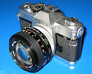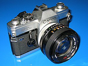 Canon FTb QL "Als Einäugige Spiegelreflexkamera der gehobenen Mittelklasse hat die FTb im Laufe der Jahre Stückzahlen von weit über einer Million erreicht. So gesehen konnte sie über lange Zeit hinweg als das eigentliche "Arbeitstier" dieser Reflexreihe gelten. [...] Sie ist eine Präzisionskamera, deren Ausstattung durchaus auch für eine ganze Reihe beruflicher Aufgaben ausreicht. [...] Interessant ist die Verwendung des gleichen Innenmeßsystems wie in der F-1, das bereits auf die hohen Aspirationen der FTb hindeutet und einen gezielten Einsatz möglich macht." (Auszug aus dem Buch: Günter Richter - Das Canon Reflex System) Technische Daten: Erscheinungsjahr: 1971 / 1973 in der neueren Version Einäugige 35-mm-Spiegelreflexkamera mit Schlitzverschluss Durchblicksucher mit feststehendem Pentaprisma Mattscheibe mit Fresnelllinse und Prismenscheibe Sichtbereich 94% des tatsächlichen Bildbereichs Vergrößerung 0,85-fach Sucheranzeige: Meßzeiger und Blendenöffnungszeiger, rotes Anzeigefeld für untere Grenze des Funktionsbereichs, Meßmarke für die Arbeits-blendenmessung, Batterieprüfung Erschütterungsfreier Spiegel, verriegelbar in der obersten Stellung Bajonettring des Typs FD Schlitzverschluss von 1/1000 s bis 1 s und B Blitzsynchronzeit 1/60 s Auslöseknopf verriegelbar Filmempfindlichkeit von 25 - 2000 ASA Eingebauter Belichtungsmesser mit CdS-Fotozelle, Mittelpunkt-Messsystem zur Ausmessung von 12% der Bildfläche Einlegen des Films mit Schnellladesystem (QL = Quick-Load) Schnellaufzughebel durch einmalige Schwenkung um 174° Doppelbelichtung möglich Größe: 144 x 93 x 43 mm Gewicht: 740 g (nur Gehäuse) Die Bilder zeigen die Canon FTb in ihrer zweiten, leicht renovierten Fassung. Die Hauptänderungen betreffen den nunmehr schwarz belegten Schnellschalthebel, den schwarzen und kleineren Selbstauslöser-/ Abblendhebel mit einer weißen Linie und einem angefederten Schutzdeckel auf dem Kabelkontakt. Der Schnellschalthebel wurde leichtgängiger und die vorgewählte Verschlusszeit wurde nunmehr in den Sucher eingespiegelt. Zum ersten Mal wurde es somit möglich, alle Belichtungsdaten einzustellen, ohne die Kamera vom Auge nehmen zu müssen. Diese Bilder zeigen die Kamera mit einem fantastischen Objektiv: Es handelt sich um das legendäre Normalobjektiv mit 55 mm Brennweite bei einer Lichtstärke von 1:1,2 (!) - ein wahrer Lichtriese mit überragenden Abbildungseigenschaften, weist doch das "SSC" in der Bezeichnung auf die mehrfach vergüteten Linsen hin. Dieses Objektiv und nähere Daten dazu finden Sie beim FD-Zubehör - zu erreichen mit dem Link unten. Eine canontypische Besonderheit war das Schnellladesystem QL (=Quick-Load), mit welchem damals viele Canon-Kameras ausgestattet waren. Auf dem unteren Bild ist rechts der spezielle Mechanismus zu erkennen, welcher das Einfädeln auf der rechten Spule weitgehend übernommen hat - warum es wohl irgendwann wieder heimlich, still und leise abgeschafft wurde? |