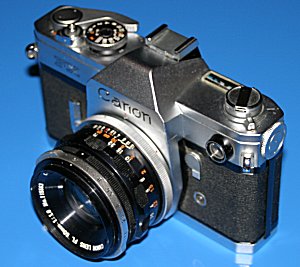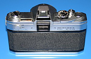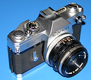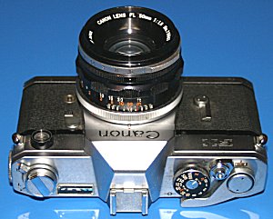 Die Canon FX - eine neue Generation "Es mag überraschen, dass die Canon FX nicht mit Innenmessung ausgestattet wurde, obwohl dies damals bereits durchaus eingeführt war. Die Canon FX legte den Grundstein für die Konstruktion vieler folgender Modelle, einschließlich der professionellen F-1. Als erste Canon SLR bot sie Spiegelvorauslösung. [...] Der neue Schnellschalthebel wurde an einer mehr >>traditionellen<< Stelle auf der Oberseite angebracht und zeichnete sich durch große Leichtigkeit aus. Auf dem Prismengehäuse befand sich ein Zubehörschuh, was wir heute noch als selbstverständlich empfinden." (Aus: Canon Handbuch - Das komplette Canon System) Technische Daten: Erscheinungsjahr: 1964 Typ: Einäugige Spiegelreflexkamera Bajonett: Canon FL Sucheranzeige: Schnittbildindikator Messzelle: CdS-Widerstand Lichtwert 1-18 Filmempfindlichkeitsbereich: 10-800 ASA Automatiken: manuell Verschluss: horizontal ablaufender Tuchschlitzverschluss Zeitenbereich: 1-1/1000s, B, X Blitzsynchronzeit (X): 1/60 s Sonstiges: Selbstauslöser, Batterieprüfer, Spiegelvorauslösung Maße (BxHxT): 141 x 90 x 43 mm Gewicht: 670 gr Die Besonderheit dieser Kamera ist auf den Bildern gut zu erkennen und ist ja auch schon im oberen Buchauszug angesprochen: Die Kamera war zwar mit einem Messsystem ausgestattet, dieses ist aber nicht mit den Sucheranzeigen gekuppelt. Das heißt, es gibt auf der Kamera-Oberseite zwar eine Messzelle (das runde "Guckloch" vorne links) und eine daran angeschlossene Anzeige des Lichtwerts (die Skala oben links) - aber die ermittelten Werte wurden nicht im Sucher mittels einer Messnadel angezeigt. Und so war es zum Beispiel aufgrund der fehlenden Koppelung auch nicht möglich, die korrekte Belichtung durch einen Messkeil mit Nachführzeiger oder eine ähnliche gekoppelte Anzeige einzustellen. Aber die vorgewählte Verschlusszeit war interessanterweise sehr wohl mit der Skala gekoppelt, so dass diese nur den erforderlichen Blendenwert anzeigte, welcher dann auf die Objektivblende übertragen werden musste. Erst danach konnte man die Kamera zum eigentlichen Fotografieren ans Auge nehmen - heute kaum noch vorstellbar. Auf dem Bild unten sehen Sie sehr deutlich den Lichtmesser ("Guckloch") und die Skala. Diese Kamerageneration war mit dem FL-Bajonett ausgestattet, was bedeutet, dass die zugehörigen FL-Objektive noch ohne Blendensimulator auskommen mussten. Die Folge war, dass eine Belichtungsmessung nur bei Arbeitsblende möglich war und hierfür abgeblendet werden musste. Diese sogenannte Arbeitsblendenmessung wurde erst mit Einführung des FD-Bajonetts abgeschafft, da sorgte dann ein sogenannter Blendensimulator dafür, dass das Messsystem wusste, welche Lichtstärke das Objektiv hat und dadurch Offenblendenmessung möglich wurde. Übrigens passen trotzdem die FD-Objektive an das FL-Bajonett und umgekehrt - unter Verlust der Offenblendenmessung beim FD-Bajonett und mit dem umständlicheren Weg der Arbeitsblendenmessung beim FL-Bajonett. |