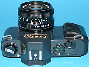 Die Canon T50 ist eine sehr einfache Kamera. Wie man am Hauptschalter auf dem linken Bild erkennen kann, gibt es nur sehr wenige Möglicheiten: Program-Automatik, Selbstauslöser, Batteriekontrolle und Aus-Schalter. Ansonsten gibt es keine Eingriffsmöglichkeiten für den Fotografen. Der Film wird durch einen Motor transportiert, zurück aber mit einer Kurbel. | |||||||||||||||||||||||||||||||||||||||||||||||||||||||||||||||||||||||||||||||||||||