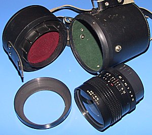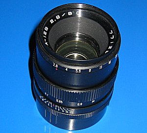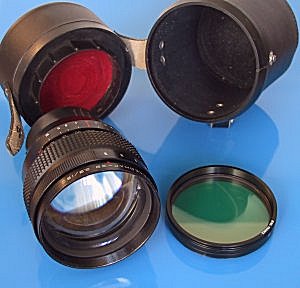 Kaleinar 3B - 150mm f2.8 - Teleobjektiv (enstpricht ca. 95mm bei 35mm-Kameras) Brennweite: 150mm Blende: f2.8 bis f22 Blickwinkel: 28 Grad Filtergröße: 82mm Konstruktion: 4 Linsen in 4 Gruppen Größe: 90 x 105 mm Gewicht: ca. 1,15 kg hier abgebildet mit Original-Köcher und -Filtern | ||||||||||||||||||||||||||||||||||||||||||||||||||||||||||||||||||||||||||||||||||||