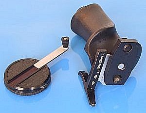Dieses Bild zeigt die Kiev-Kurbel, welche den Filmtransport erheblich vereinfacht und den Handgriff, welcher unter die Kamera geschraubt werden kann - die Auslösung der Kamera erfolgt wie bei einem Revolvergriff. | ||||||||||||||||||||||||||||||||||||||||||||||||||||||||||||||||||||||||||||||||||||