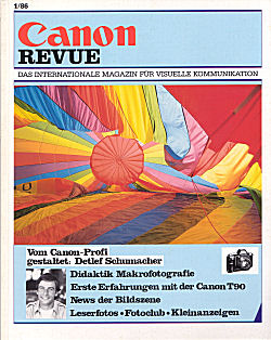 Canon Revue, Ausgabe 1/86, Themen: Bildszene - News; Praxisreport - erste Erfahrungen mit der neuen Canon T90; Vom Canon-Profi gestaltet: Detlef Schumacher; Fotodidaktik: Einführung in die Makrofotografie; Pressereport: Canon in der Presse; Fotoclub Galerie |