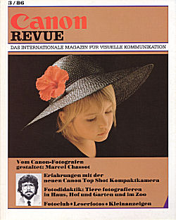 Canon Revue, Ausgabe 3/86, Themen: Spot - Aktualitäten aus dem In- und Ausland; Vom Canon-Fotografen gestaltet - Marcel Chassot; Fotodidaktik: Tiere fotografieren in Haus, Hof und Garten und im Zoo; Fotoclub Galerie; Erfahrungen: Die brandneue Canon Top Shot |