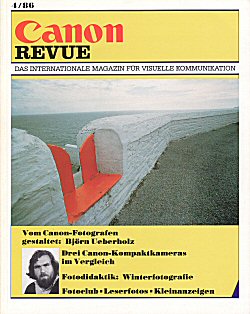 Canon Revue, Ausgabe 4/86, Themen: Spot - Aktualitäten aus dem In- und Ausland; Vom Canon-Fotografen gestaltet - Björn Ueberholz; Fotodidaktik - Alles über Winterfotografie; Fotoclub Galerie; Kaufberatung; Leserfotos, Leserbriefe; Kleinanzeigen |